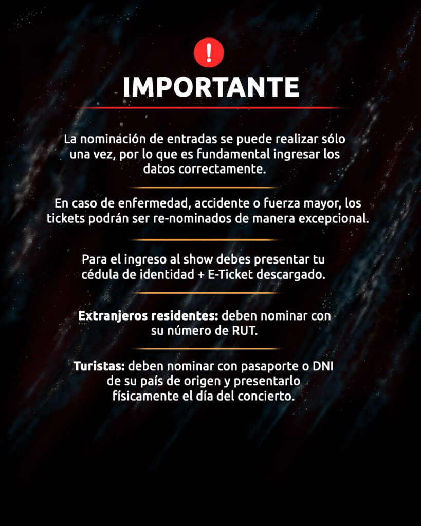 El día del show, los asistentes sólo podrán ingresar con su cédula de identidad y su E-Ticket descargado. Los extranjeros residentes deben nominar sus tickets con su número de RUT, mientras que los extranjeros no residentes, que cuenten con pasaporte o DNI emitido en su país de origen, podrán nominar sus entradas con este documento, el que deberán mostrar físicamente el día del concierto para ingresar al recinto.