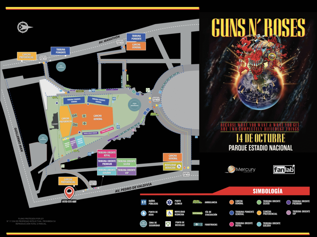 Servicios y amenidades: Cabe destacar que el Parque Estadio Nacional estará acondicionado para que las personas tengan la mejor experiencia durante el concierto. Entre otras, contará con carpetas cubre piso, baños y enfermería, Puntos de Hidratación, activaciones venta de alimentos y merchandising oficial.
